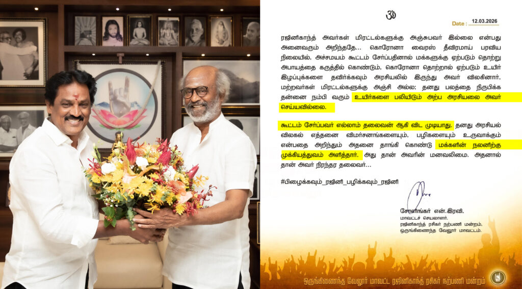 சோளிங்கர் என்.ரவி வெளியிட்டுள்ள அறிக்கையில்,”ரஜினிகாந்த் அவர்கள் மிரட்டல்களுக்கு அஞ்சுபவர் இல்லை என்பது அனைவரும் அறிந்ததே…கொரோனா வைரஸ் தீவிரமாய் பரவிய நிலையில், அச்சமயம் கூட்டம் சேர்ப்பதினால் மக்களுக்கு ஏற்படும் தொற்று அபாயத்தை கருத்தில் கொண்டும்,கொரோனா தொற்றால் ஏற்படும் உயிர் இழப்புக்களை தவிர்க்கவும் அரசியலில் இருந்து அவர் விலகினார். மற்றவர்கள் மிரட்டல்களுக்கு அஞ்சி அல்ல; தனது பலத்தை நிருபிக்க தன்னை நம்பி வரும் உயிர்களை பலியிடும் அற்ப அரசியலை அவர் செய்யவில்லை.கூட்டம் சேர்ப்பவர் எல்லாம் தலைவன் ஆகி விட முடியாது.